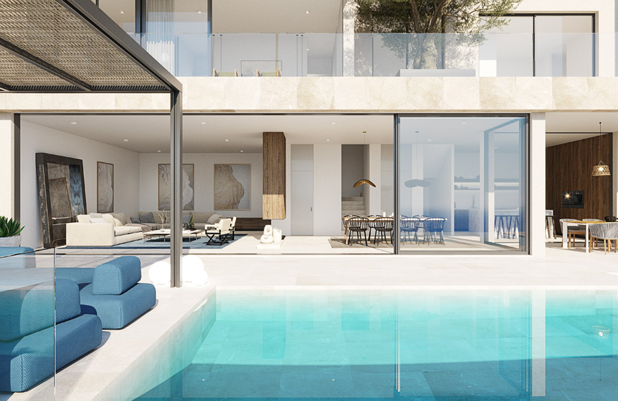 Esta vivienda con plena vista mar, situada en Cala Llamp, tiene una larga piscina sin límites en la planta baja que se conecta con un espacio diáfano con cocina, comedor y salón. En la primera planta se encuentra el dormitorio en suite, un baño y un vestidor. Además, el sótano incluye una piscina interior climatizada. Los tonos neutros y claros se mimetizan con el entorno mediterráneo.